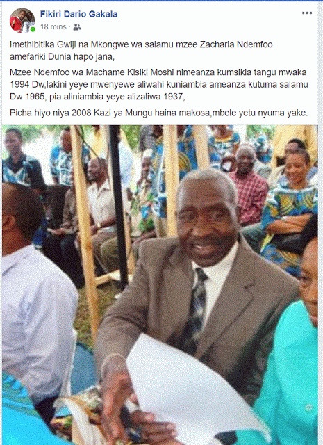Gwiji na Mkongwe wa salamu Redioni Mzee Zacharia Ndemfoo (83) wa Machame Kisiki Moshi mkoani Kilimanjaro amefariki dunia jana Ijumaa Januari 17,2020.